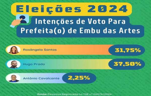 Eleitoral (TSE) revelou que a disputa pela prefeitura de Embu das Artes (SP) está acirrada. O cenário é de empate técnico entre Hugo Prado (Republicanos), com 37,50%, e Rosângela Santos (PT), que aparece com 31,75% das intenções de voto.